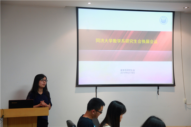 会议开始,首先由第二届数学系研究生会主席陈曦作2013-2014学年数学系研究生会述职报告,她汇报了一年来系研会的工作,介绍了各大活动的开展情况,并对活动意义进行深入分析。