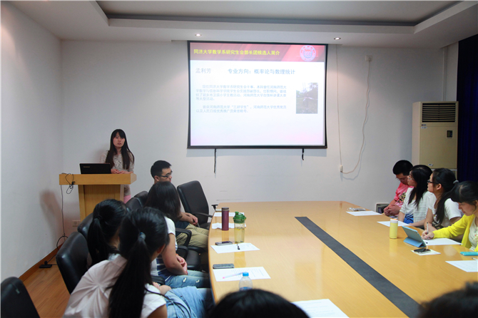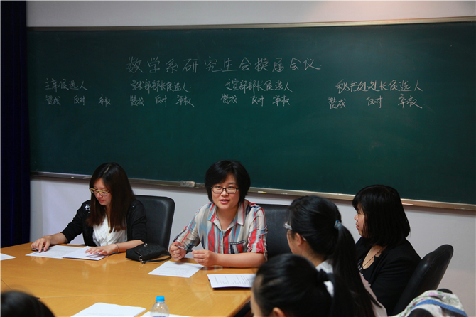 2014年6月19日中午12点15分,数学系研究生会换届大会在致远楼102会议室顺利召开。数学系党委副书记李静茹、数学系分团委书记金文心和研究生会指导老师李杨帆出席会议,系研究生会代表、数学系研究生各班级代表参加了会议。会议选举产生了第三届数学系研究生会主席团成员和各部门部长,由第二届数学系研究生会主席陈曦主持。