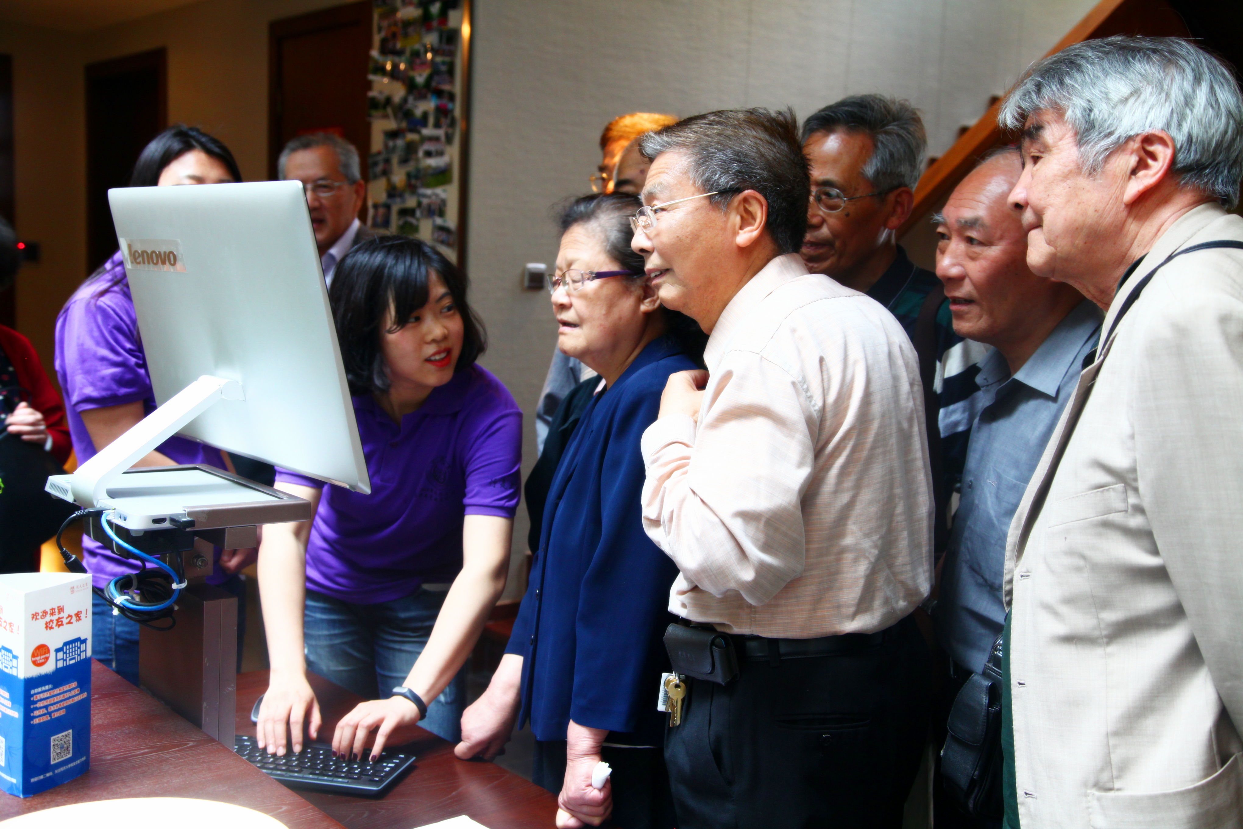 当日上午,校友们在志愿者的引导下参观了校友之家—旭日楼,并在校史馆重温了母校的百年历史。在校友之家,校友们寻找当年入学时的照片,看着照片上的青春面孔,两鬓已经斑白的校友们不禁感慨时间的匆匆,说起了当年在同济读书期间的种种难忘经历。校友们提议登高看看同济,在了解校友们的意愿后,志愿者随即与图书馆工作人员联系参观事宜。据校友回忆:当年校友们也为寸止
