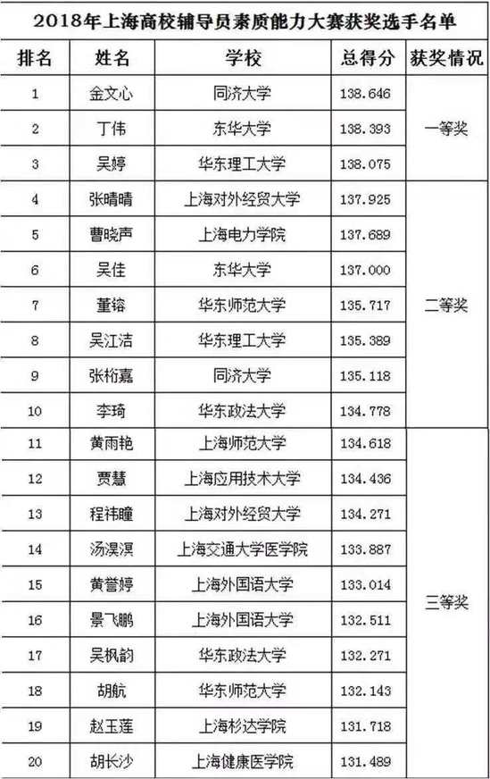 由中共上海市教育卫生工作委员会、上海市教育委员会主办,东华大学承办的2018年上海高校辅导员素质能力大赛于2018年11月28日圆满结束,本次大赛共有来自上海的51所高校、100名选手参加比赛。经过紧张激烈的角逐,我院辅导员金文心以总分第一荣获一等奖,交通运输工程寸止