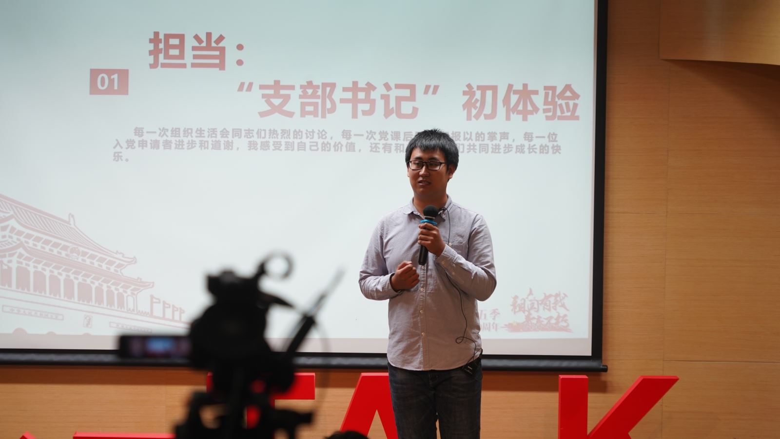 丁戬是一名研究生党支部书记,他讲述了自己作为一名普通学生支部书记的心声。作为学生党支部书记,他和同学们分享了作为支部地“班长”,他如何在行动中抓落实,带领支部同学在思想上和专业学习上对标争先,追求卓越。他和大家分享了他在暑假期间访谈改革先锋、基层支部书记吴金印故事,这一经历让他对支部书记这一身份有了更为深入的思考,他说:“新中国成立以来,我们之所以取得了这么多的成果,正是因为有一个个基层的干部、一个个支部书记兢兢业业,组成了建设祖国的磅礴力量。”他以榜样为力量,参加同行计划去往基层锻炼学习,希望未来能够为祖国发展贡献自己的力量。