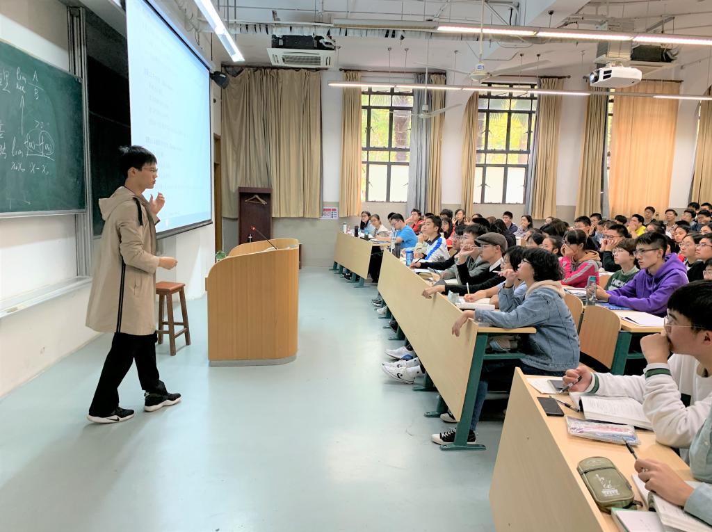“吃在同济”说的不一定是食堂里的饭菜,也可能是校园里输送着的某种精神食粮,譬如“数学外卖”。这不,距离上课还有十多分钟,能容纳200人的阶梯教室里已经坐满了赶来“加餐”的同学,有些同学来晚了,那就站着听完全程。一个半小时的讲座,寸止