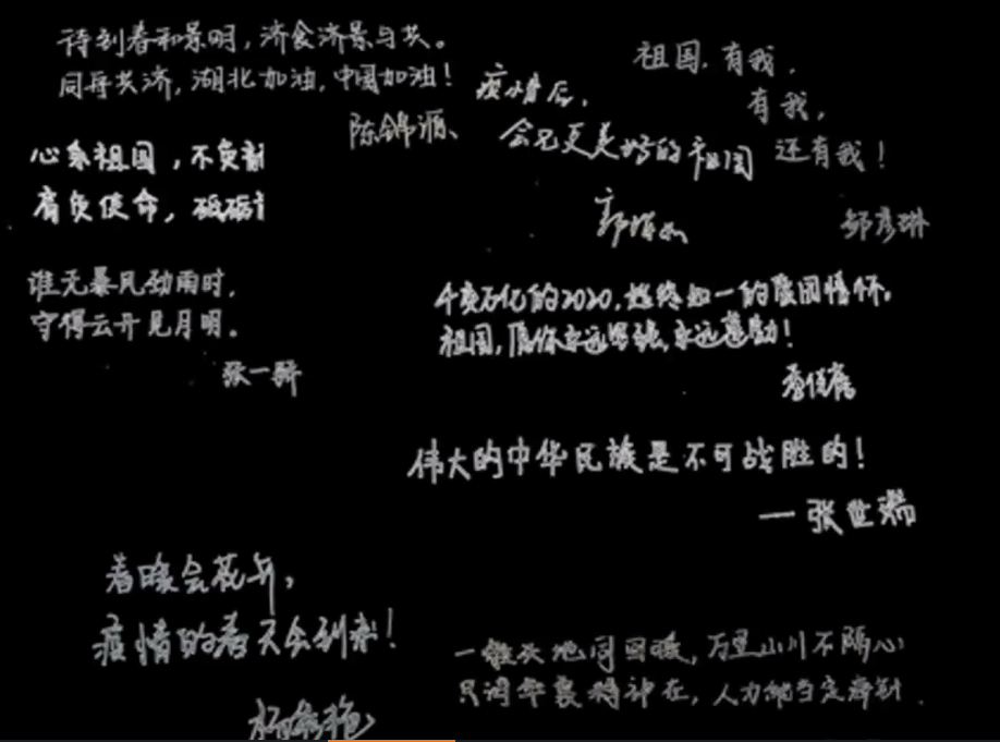 第一篇章“我亲历“的6名讲述者依次分享了他们的故事。家住武汉的大四学生宇果,主动报名成为了江岸区劳动街社区卫生服务中心的一名志愿者,她目睹了战斗在大后方的社区工作人员的艰辛与不易,对家乡、对祖国的热爱也支撑着她坚守在志愿者的岗位之上。研一的孙成权,来自湖北恩施,平日里一心扑在学习上的他,主动站了出来成为了一名抗疫志愿者,日复一日喷洒的消毒水使他的裤脚从黑色变成了紫色,挨家挨户走访、测体温、宣讲政策,在村口执勤一站就是一整天。他说,想到中国有千千万万个认真负责的基层干部,团结一致、积极配合的人民,他对战胜疫情充满了信心,也为自己能够贡献一份力量而感到荣幸。同样身在武汉的陈心怡,讲述了她所在的小区在收到来自广东省徐闻县村民捐赠的免费蔬菜的感受,王锦源、刘子琦、田皓天则分别分享了自己看到的生活社区严防严控、全国上下众志成城抗击疫情的故事。在这场没有硝烟的战争中,同数青年看到了希望、看到了责任,真正体会到中华民族同舟共济、守望相助的中国力量。