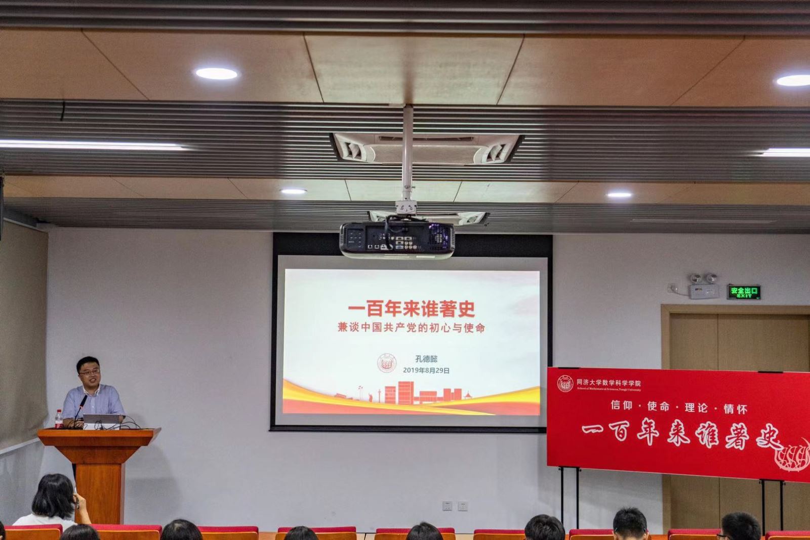 孔德懿老师从国史、党史、世界史三个方面分析了不忘初心,坚定信念的重要性,向在座学子揭示中国共产党之所以发展壮大、历久弥新的“奥秘”。他讲述了三千年的文明史和曲折的近现代史,引发学生对历史的思考与共鸣;随后分享彭德怀、陈毅、朱德等优秀共产党员事迹,让学生切身感受中国共产党是具有坚定信仰的政党,中国共产党人的初心和使命,就是为中国人民谋幸福,为中华民族谋复兴;最后勉励同济数学青年在今后的学习生活中,理想坚定,做推动社会进步的奉献者;志向远大、做中国特色社会主义新时代的奋斗者;知行合一、做脚踏实地的实干家。