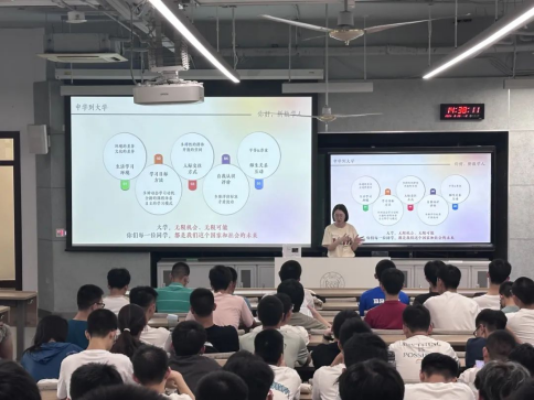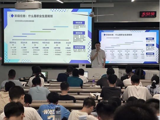 辅导员陈锦源老师对新生开展职业生涯规划教育,分析了数院学生的就业形势和未来的职业路径,帮助学生强化自我认知、职业认知,培养学生们的生涯规划意识,更好规划大学学习生活,迈好职业发展第一步。