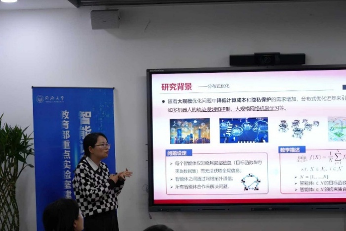 )和雷金龙(电子与信息工程学院),分别以《互斥Vlasov-Poisson系统的渐近行为》《Interior eigensolvers with domain decomposition for symmetric elliptic eigenvalue problems》《黎曼流形上的分布式随机优化算法研究》为题,汇报了实验室三个研究方向的代表性成果。