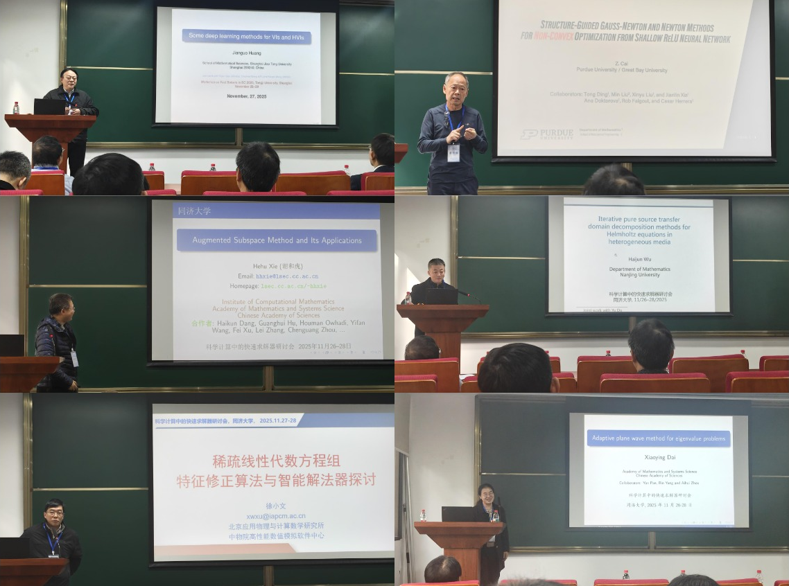 会议邀请了上海交通大学黄建国教授,南京大学武海军教授,大湾区大学蔡智强教授,北京应用物理与计算数学研究所徐小文研究员,中国科学院数学与系统科学研究院谢和虎研究员、戴小英研究员等来自全国17所高校的22位知名专家参会并作报告。会议内容涵盖深度神经网络求解器、区域分解与多重网格预处理、高频波动与特征值快速算法、人工智能辅助自适应方法、多物理耦合等方向。与会专家围绕多尺度问题高精度算法、高波数Helmholtz方程快速求解、ReLU网络非凸优化、平面波离散的后验误差估计、椭圆型两水平Schwarz预处理方法、Boltzmann-BGK张量列格式等前沿课题作精彩报告并展开研讨,为国产智能求解器、大模型与科学计算融合提出宝贵意见建议。
