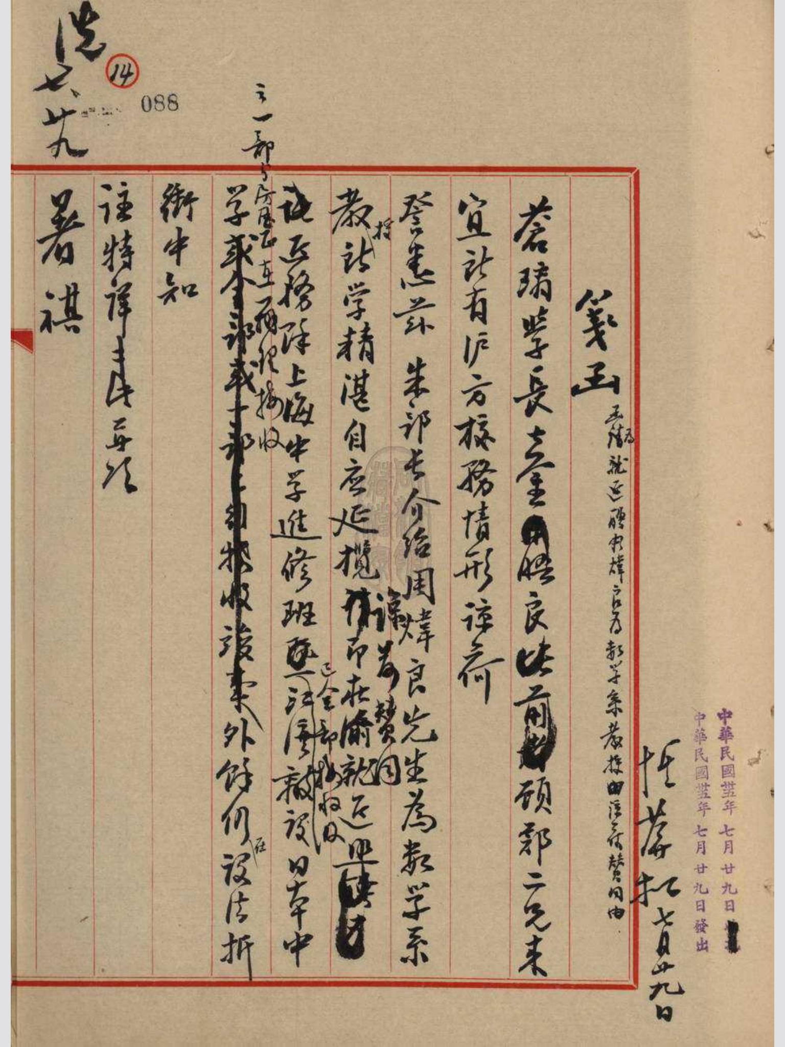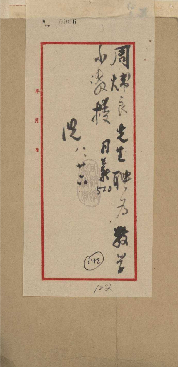 (聘周炜良先生为数学系教授笺函内页留存 寸止