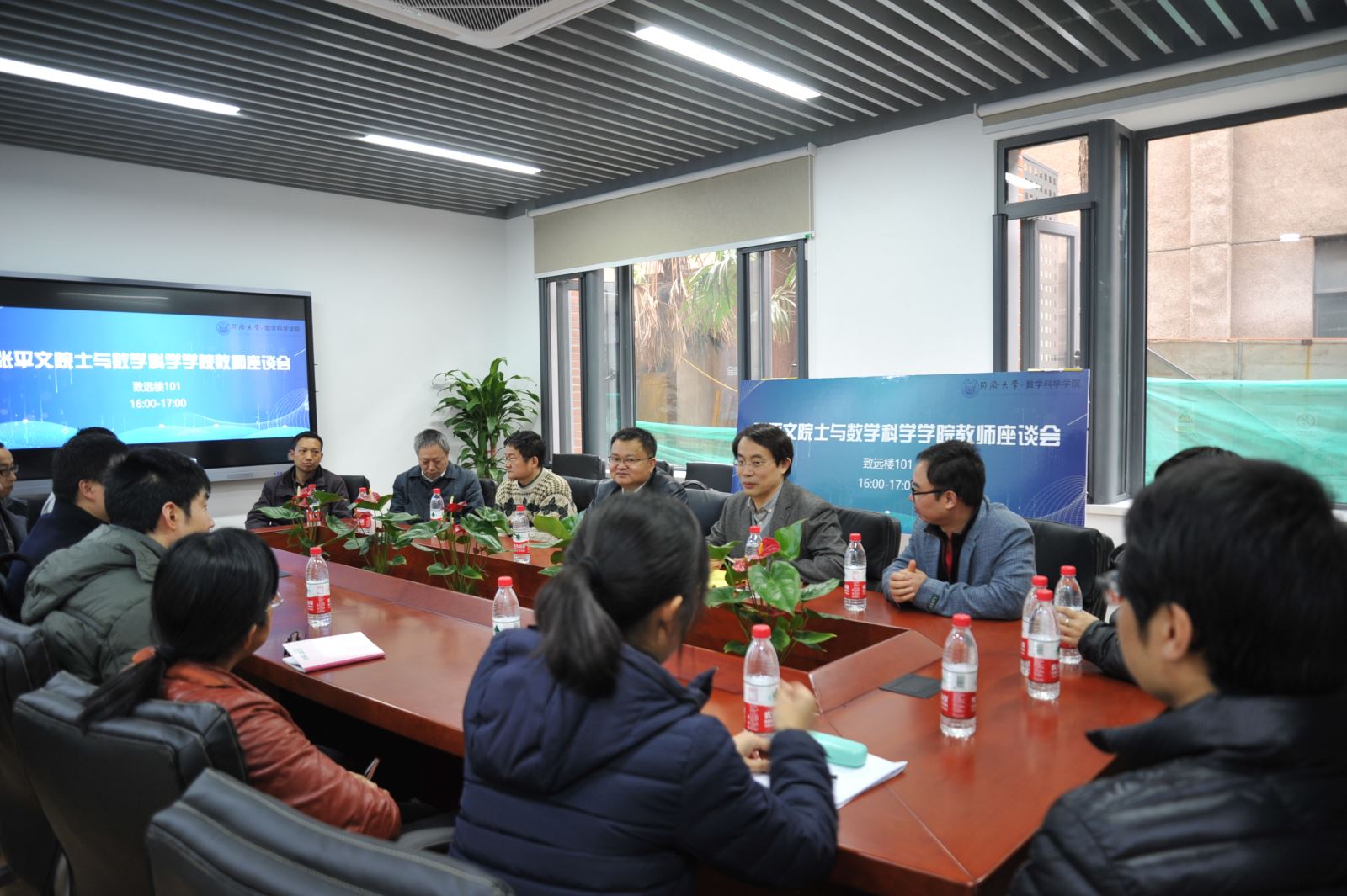 教师开展了学术座谈。我院国家杰出青年基金获得者许学军教授、芮和兵教授,优秀青年科学基金获得者付强教授、李平教授, 姜立建教授等出席了座谈会。张院士与青年教师交流了学习和研究应用数学的方法,分享了个人对偏微分方程研究的看法,探讨了对横向项目申请的建议;他还介绍了北大在培养青年教师的成功经验,鼓励青年教师要对数学研究有信心,告诫大家在做学问、学术合作方面均要认真对待,同时还提醒青年教师要多和本科生接触,掌握本科生的学习状况,可以看出张平文院士对青年教师寄予的深切期望与无限关怀。