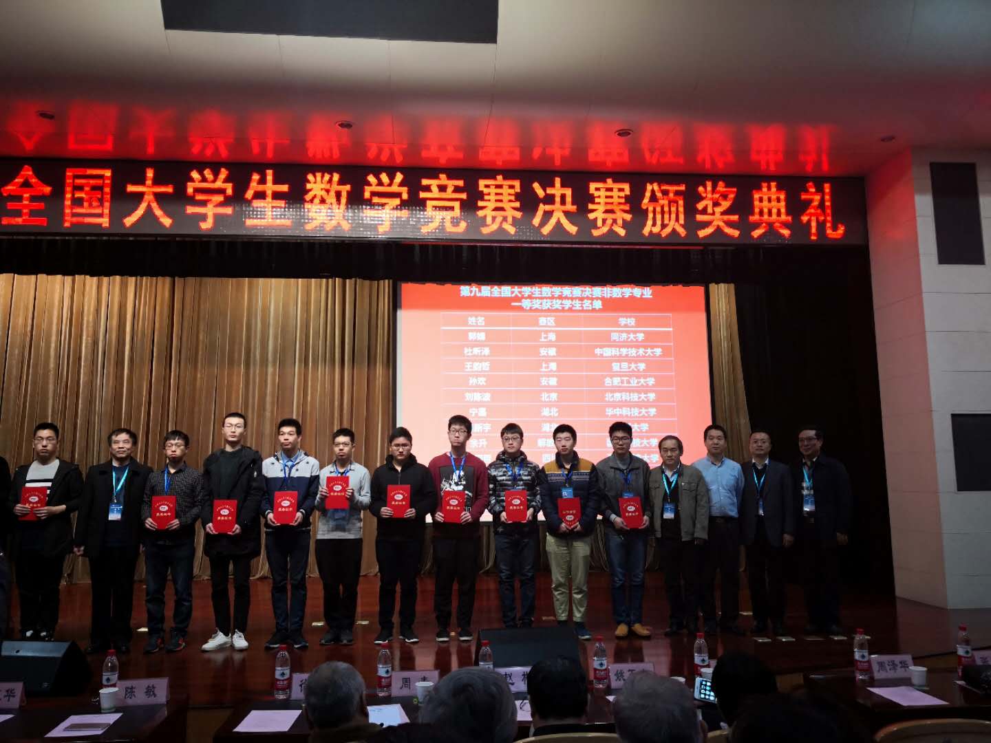 2018年3月25日,由中国数学会举办的第九届全国大学生数学竞赛决赛在西安交通大学顺利落幕,同济学子再创历史最好成绩。郭靖、张智扬分获非数学类全国一、二等奖;刘裕德获得数学类(高年级组)二等奖。值得一提的是郭靖以96分的优异成绩位居非数学类全体参赛选手第一名,这一成绩再一次印证了寸止