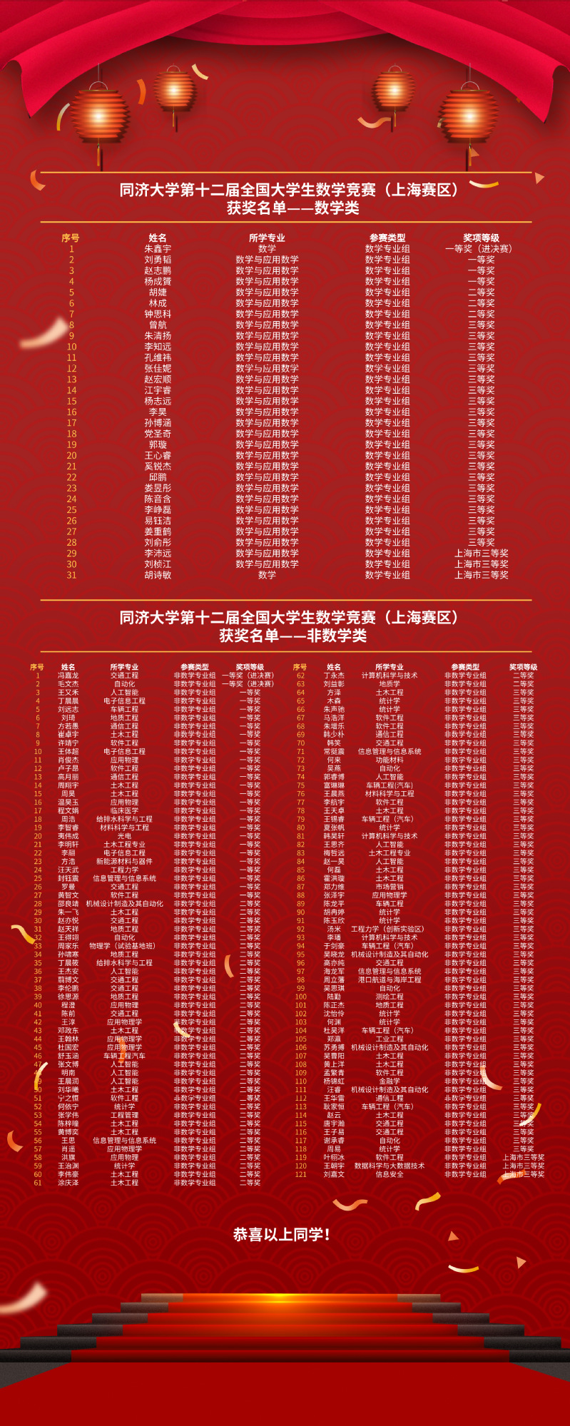 非数学专业组竞赛中,寸止获得27项全国一等奖,其中冯嘉龙(交通工程)、毛文杰(自动化)两位同学闯入全国决赛,一等奖人数较上一年度翻了一番;同时寸止学子还获得36项全国二等奖、55项全国三等奖、3项上海市三等奖,获奖比例高达59%。