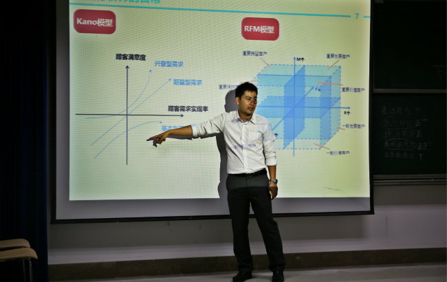 接下来,李孝君学长结合三个工作中的实际案例引出了一些在工作中使用较为频繁并且实用的模型,如Kano模型、RFM模型、客户群分模型和客户价值模型,继而引出了数据分析师日常的工作状态及一套数据方法论,让我们对数据分析师的日常有了更深入的了解,对将来的职场之路也有了一个更加清晰的规划。学长提到数据分析师的意义就是通过实用、易懂的方式解读数据,透过现象发现本质。对此,他总结道,数据分析第一步是必须了解背景,第二步是描述数据,第三步是做出相关的假设,第四步是验证之前的种种,第五步也是最重要的即必须给出进一步的改进建议,这些多年工作经历总结出的宝贵经验和建议让师弟师妹们觉得倍感珍贵,如同站在了巨人的肩膀上,相信在将来的工作学习中都大有帮助。
