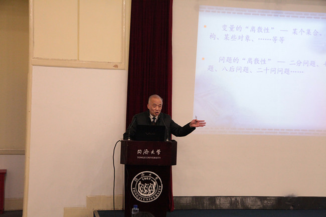 讲坛伊始,丁教授带同学们回顾了离散数学的基础知识。他由二分问题、七桥问题、八后问题等离散数学中的几个经典案例入手,简要概述了离散数学的研究对象。丁教授提醒同学们不要因为数学建模中问题的局限性而忽略了算法的复杂性,并强调了面对实际问题时要时刻谨记化繁为简的思维方式。