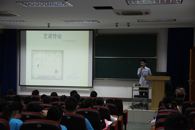 14级硕士生蒋玉麟率先讲述他所见的数学的理与美。他从芝诺悖论和囚徒困境等数学中有意思的小问题讲起,激发同学们对于数学的兴趣及对于逻辑问题的思考。接着,他从莫比乌斯环与黄金分割入手,讲解数学中的美与艺术,让同学们感受到数学并不是一门枯燥乏味的学科,而是充满了想象力与生命力。