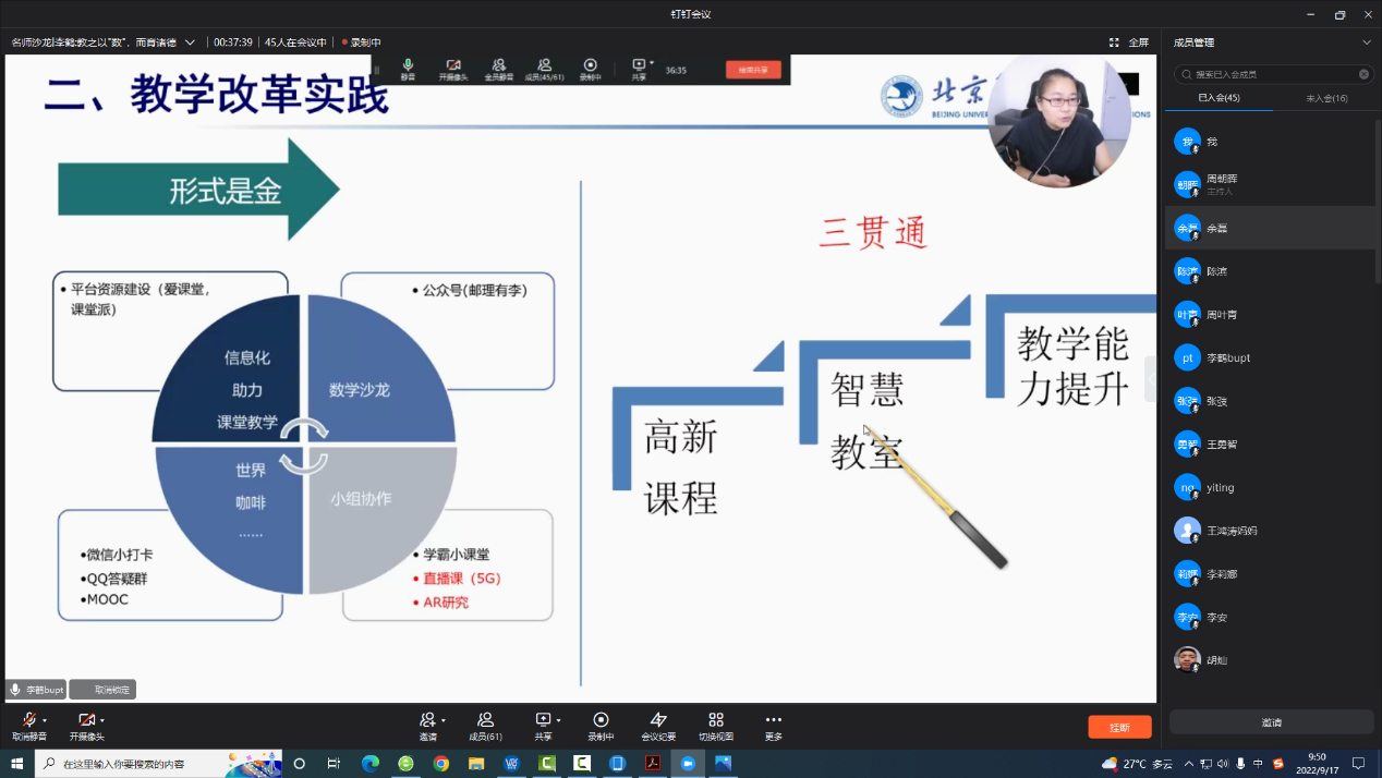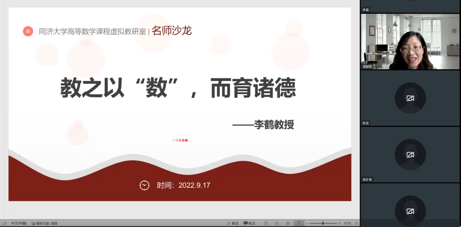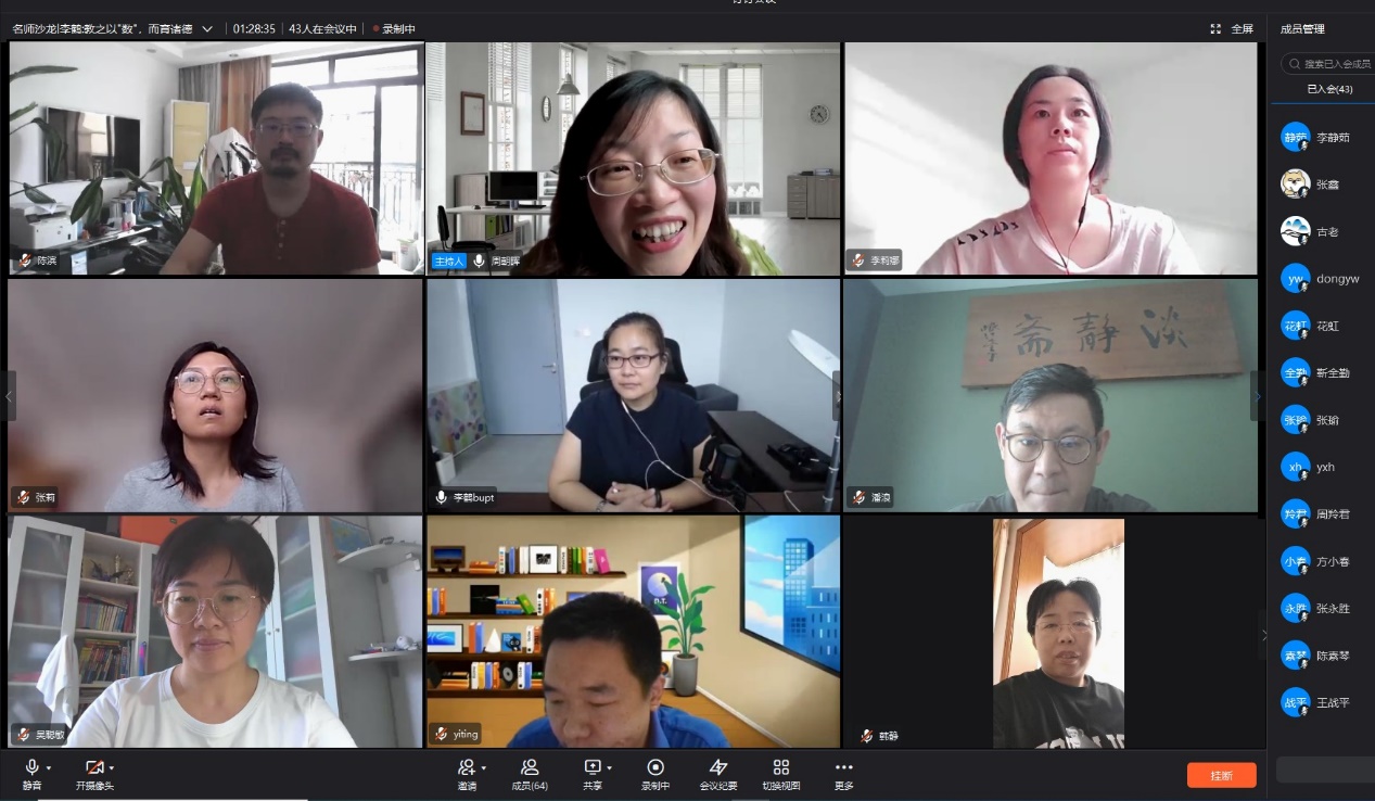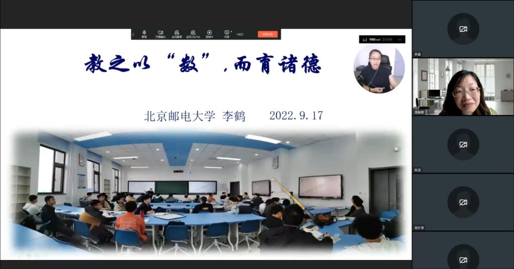 本次教研活动通过虚拟教研室平台在线开展,由虚拟教研室负责人周朝晖教授主持,北京邮电大学李鹤教授作题为“教之以‘数’,而育诸德”的主题报告,近50位与会教师围绕大学数学教学改革、课程思政建设等内容进行了深入的研讨和交流。