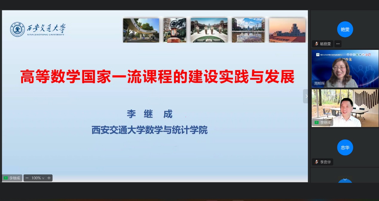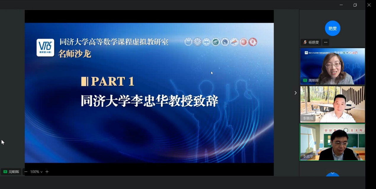 副院长李忠华教授参加本次活动并致辞。本次教研活动通过虚拟教研室平台在线开展,由教研室负责人周朝晖教授主持,虚拟教研室成员及来自全国多所高校的大学数学课程建设负责人、骨干教师等参加了本次会议。