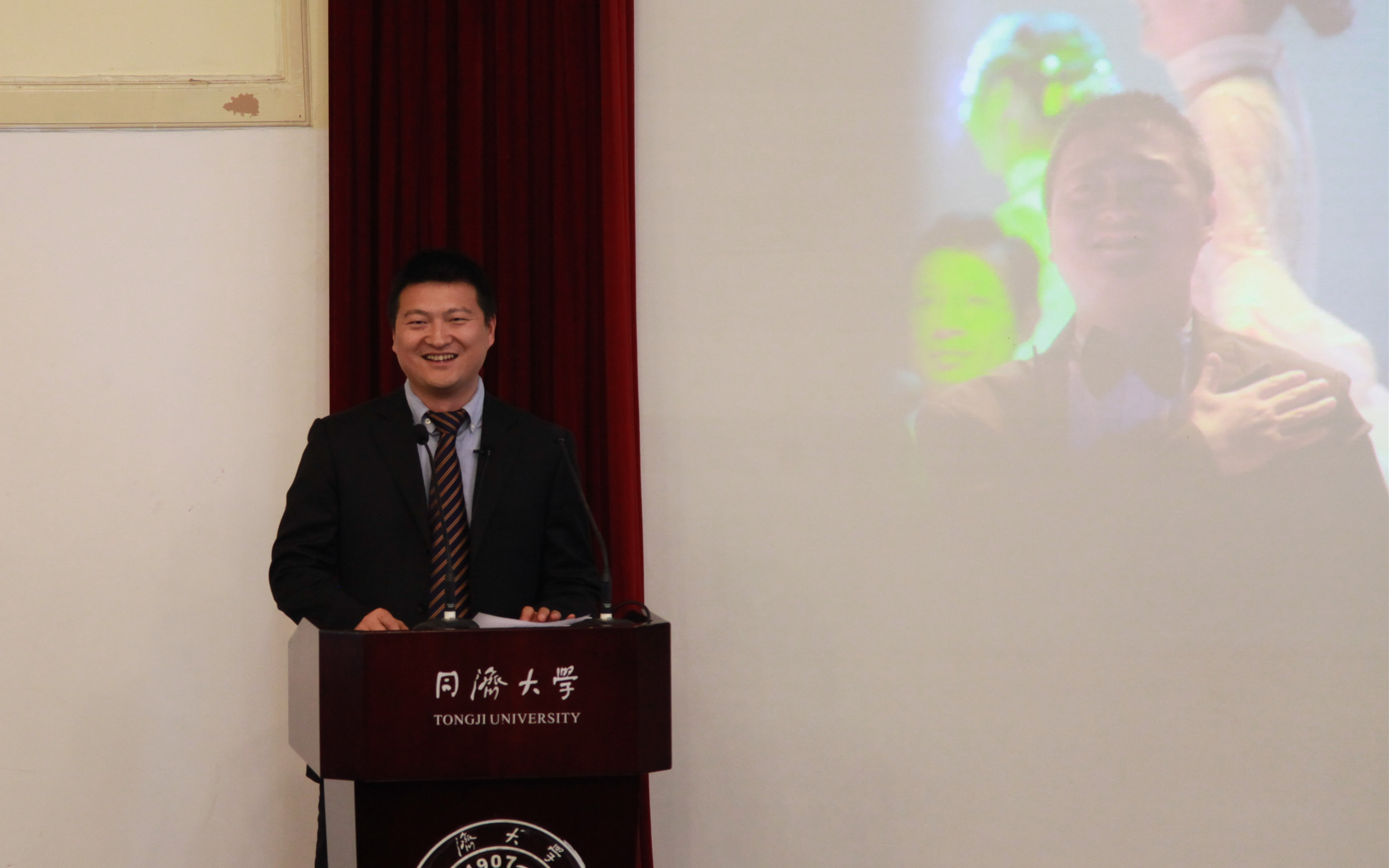 殷俊锋教授首先出场。“殷殷教诲,俊逸如锋“,是到场的数学系同学们在殷老师走上讲台前喊出的口号,饱含着同学们对殷老师的喜爱与期盼。殷老师上台后并没有直接介绍自己的科研成果、教学经验及其丰富的履历,而是用一首诗歌为大家道出了自己与教师这个职业、自己与数学之间五彩纷呈的故事。