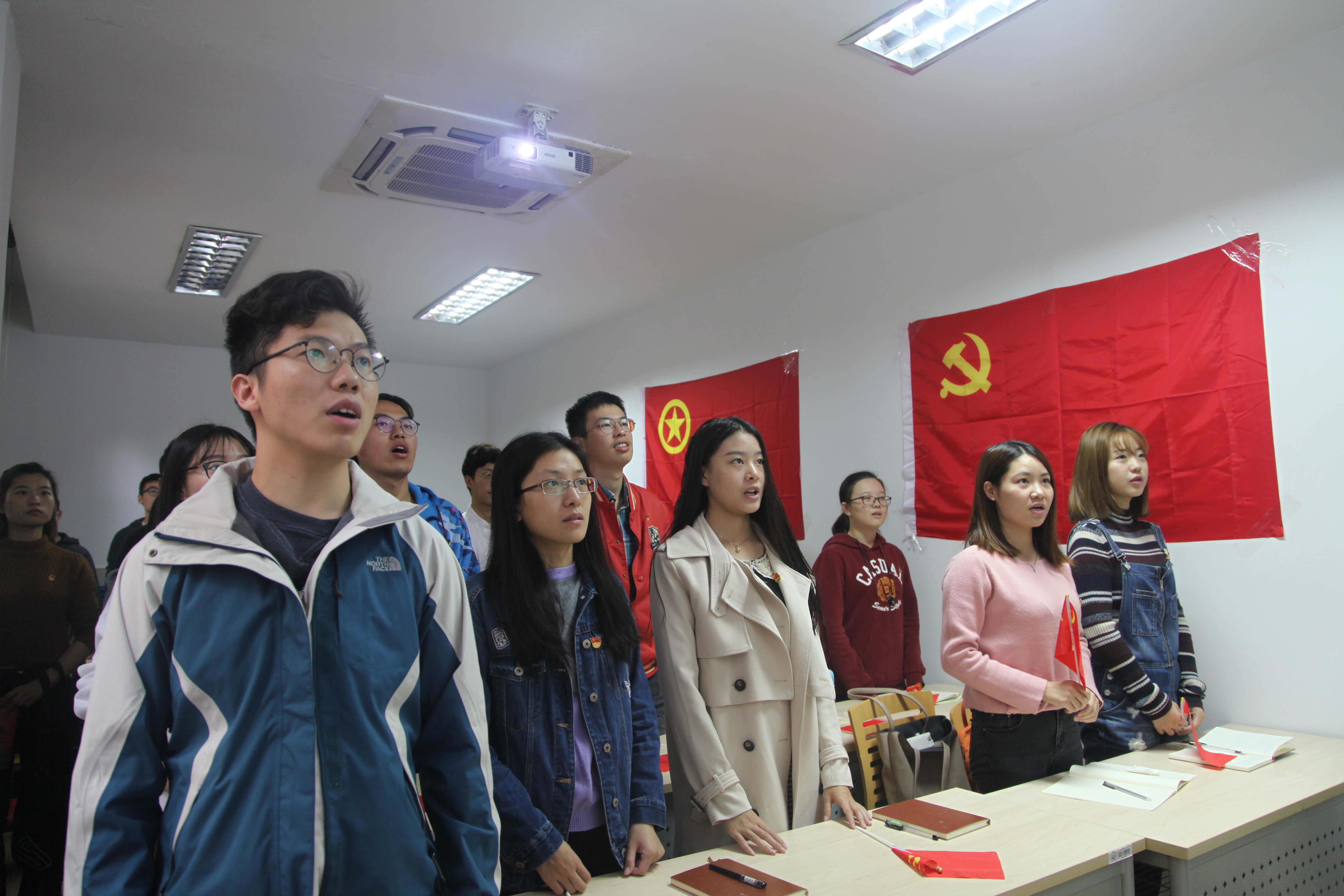 国歌响起,全体起立,所有党员均佩戴着党徽、团员佩戴着团徽,神情庄严,高唱国歌。